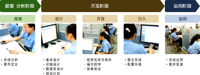 请把耗时长、负荷大、耗费公司资源的系统开发,交由DCS帮您完成。工作现场有日籍员工常驻,可提供与日本国内相同的开发环境,从而保证系统开发顺利进行。